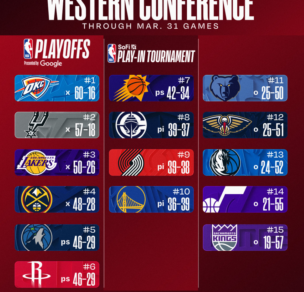 最新排名:湖人掘金双双锁定季后赛,快船落位附加赛,骑士争东1无望