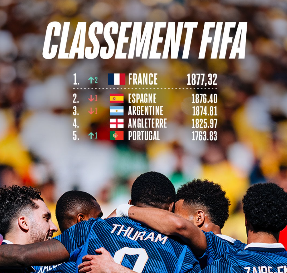 FIFA最新排名:法国重返榜首,国足再跌至第94位